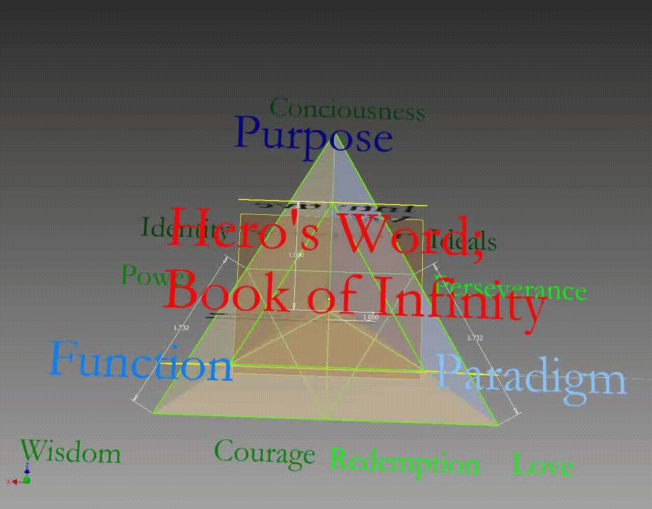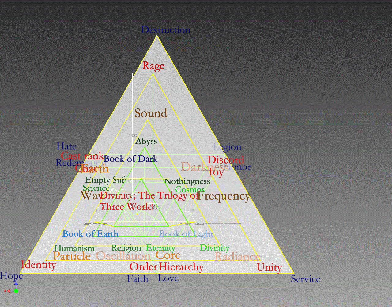 Same would apply for the next The book of force would would be Substance, Motion and Acceleration. Ascended value Gravity. Substance would break down into Solid, Liquid and Gas. Ascended laterally would be Plasma. Motion would break down to 3 parallel elements Linear, Reciprocating and Rotating. Laterally ascending would be the Folding. Acceleration broken down to 3 parallel elements would be Thrust, Speed and Resistance. The laterally ascending would be (smell, sound and light)Barriers.